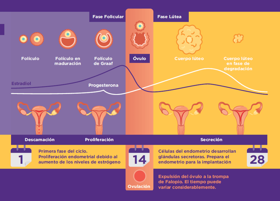 Como ya hemos comentado, es una compleja interacción de hormonas la que controla el ciclo menstrual. Durante cada ciclo, la elevación de los niveles hormonales provoca que el ovario desarrolle un óvulo y lo libere (ovulación). Al mismo tiempo, el revestimiento del útero también comienza a engrosarse, preparándose por si se produce un posible embarazo.